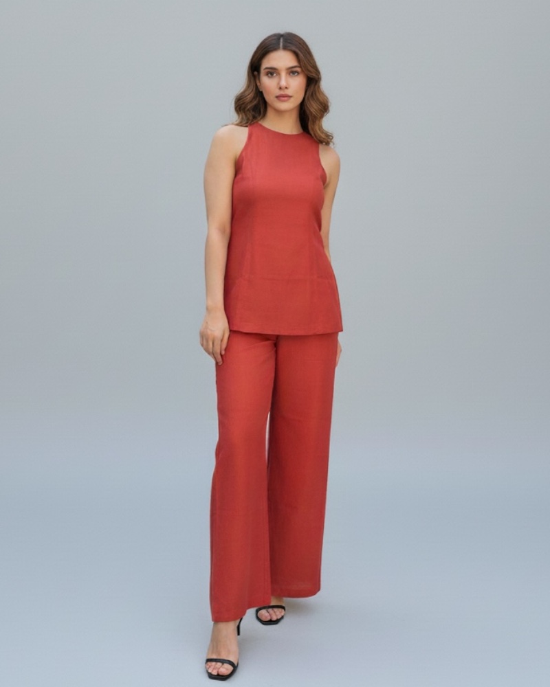Make a statement in understated luxury with this Women’s Halter Neck Co-ord Set. Designed in a warm and earthy hue, this two-piece ensemble features a structured halter-neck top paired with wide-leg trousers — combining minimalism with elegance. The breathable blended linen fabric ensures all-day ease, while the clean silhouette flatters every body type. Perfect for brunches, vacations, and evening gatherings, this co-ord set transitions seamlessly from day to night with timeless style.