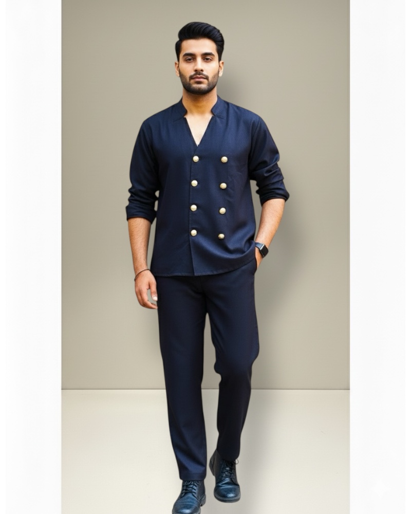 Command attention with the Midnight Noir Men’s Coat Style Shirt & Trouser Coord Set with golden button detailing, a refined blend of elegance and modern style. Crafted in a deep black hue, this ensemble features a sharp V-neck shirt enhanced with statement gold button detailing that elevates its timeless appeal. The relaxed yet tailored silhouette ensures effortless comfort without compromising on sophistication.