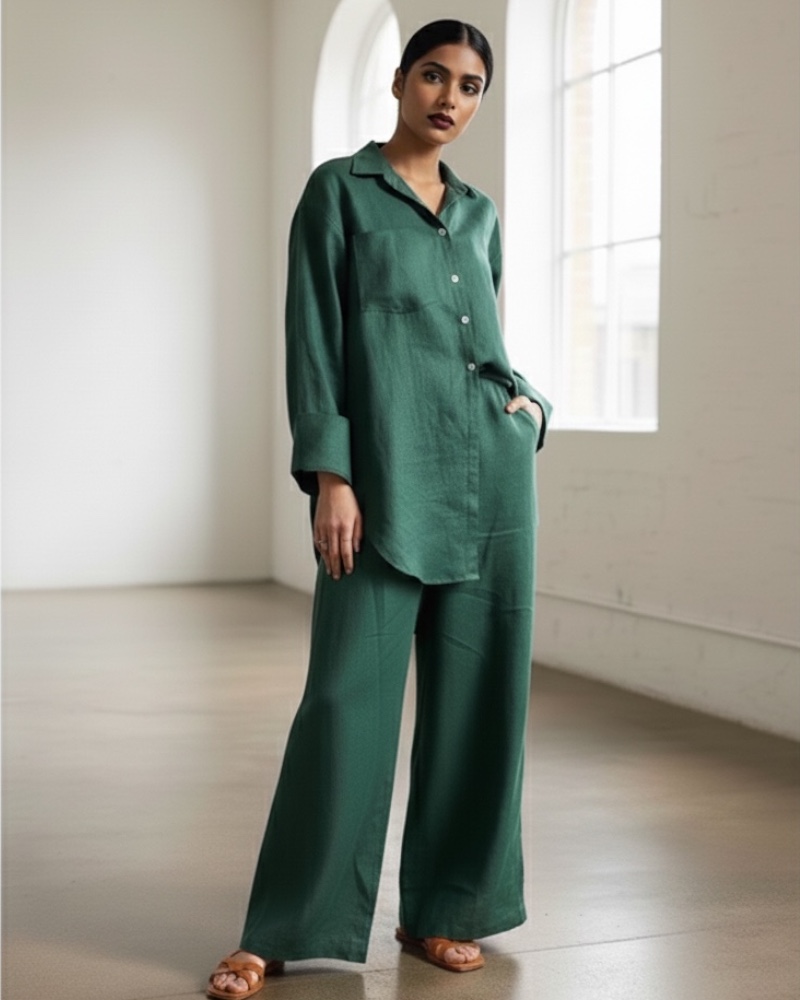A chic co-ord set featuring a longline shirt with full sleeves and matching wide-leg trousers. Crafted in breathable linen for all-day comfort and effortless style.